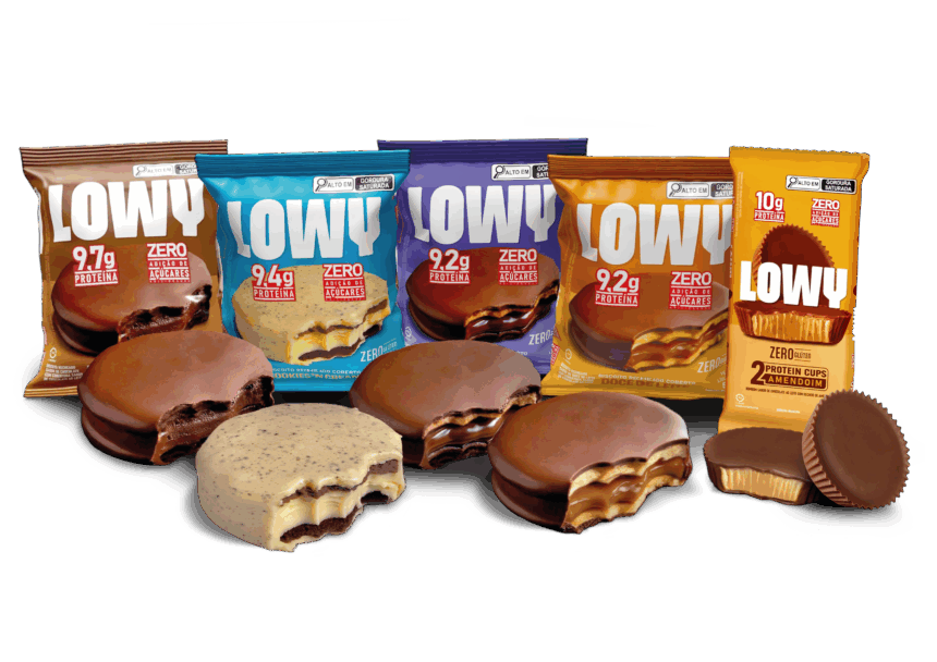 A linha completa inclui: LOWY Protein Cups, sabor amendoim; além da linha LOWY Biscoito recheado coberto, em quatro versões: cookies’n cream, doce de leite, triplo chocolate e avelã.