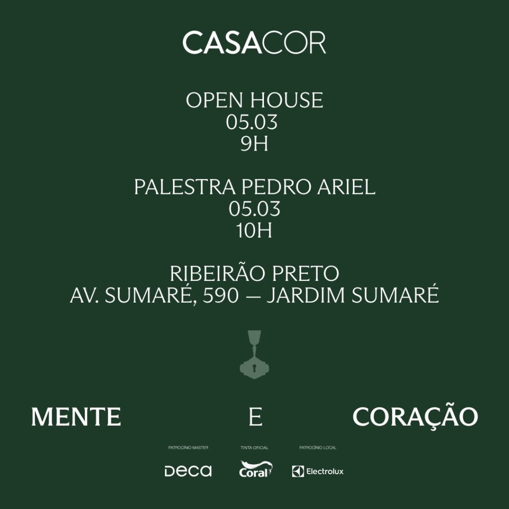 O evento contará também com a palestra de Pedro Ariel , diretor de Relacionamento e Conteúdo da CASACOR, que apresentará o tema da edição, “Mente e Coração”, e os conceitos que irão nortear a mostra.